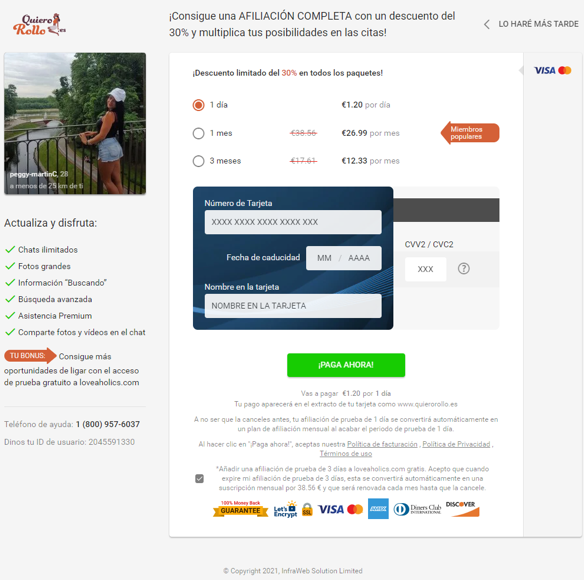 Al igual que muchas páginas de citas, las suscripciones se renuevan automáticamente. Las suscripciones de un día se convierten automáticamente en una suscripción mensual.