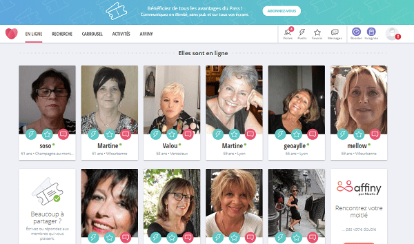 En ligne : grâce à cette fonctionnalité, vous pouvez voir en instantané qui est connecté et en ligne et les contacter immédiatement pour tchater en direct. Les profils connectés affichés en premier sont d’abords ceux se trouvant près de chez vous mais vous pouvez agrandir votre périmètre de recherche si vous le souhaiter.