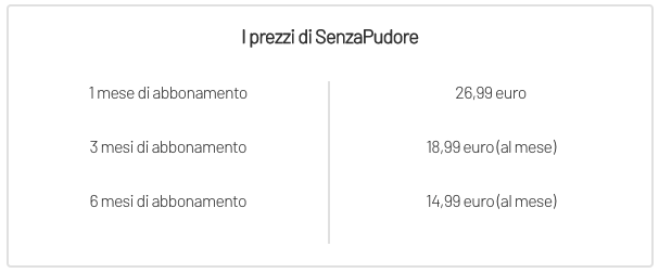 Come potrai constatare tu stesso/a, i prezzi sono davvero accessibili, specialmente rispetto agli altri siti online. Avrai accesso a servizi premium a prezzi davvero scontati. Questi sono esempi dei prezzi degli abbonamenti mensili di SenzaPudore.